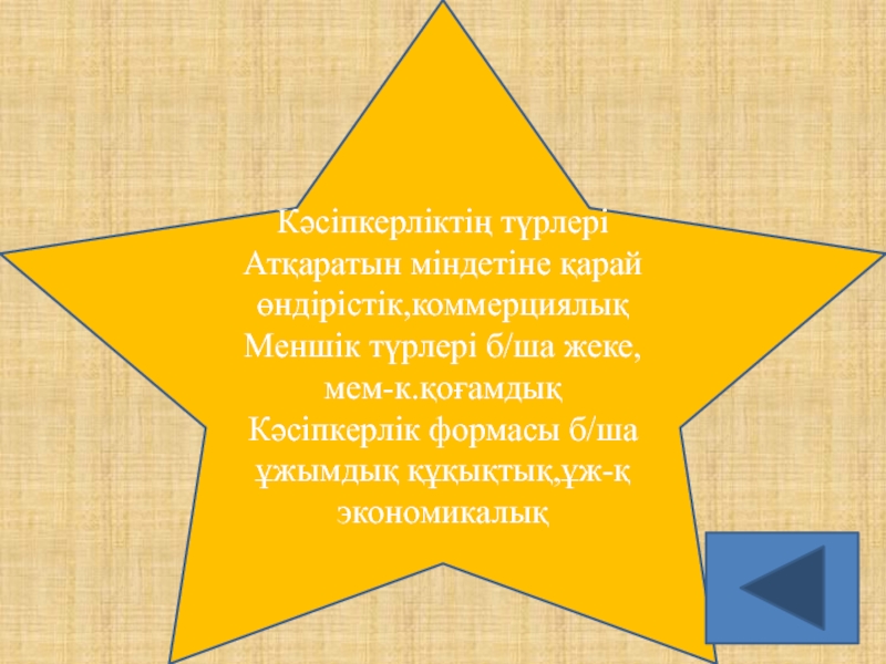 Кәсіпкерліктің түрлері Атқаратын міндетіне қарай өндірістік,коммерциялықМеншік түрлері б/ша жеке,мем-к.қоғамдықКәсіпкерлік формасы б/ша ұжымдық құқықтық,ұж-қ экономикалық
