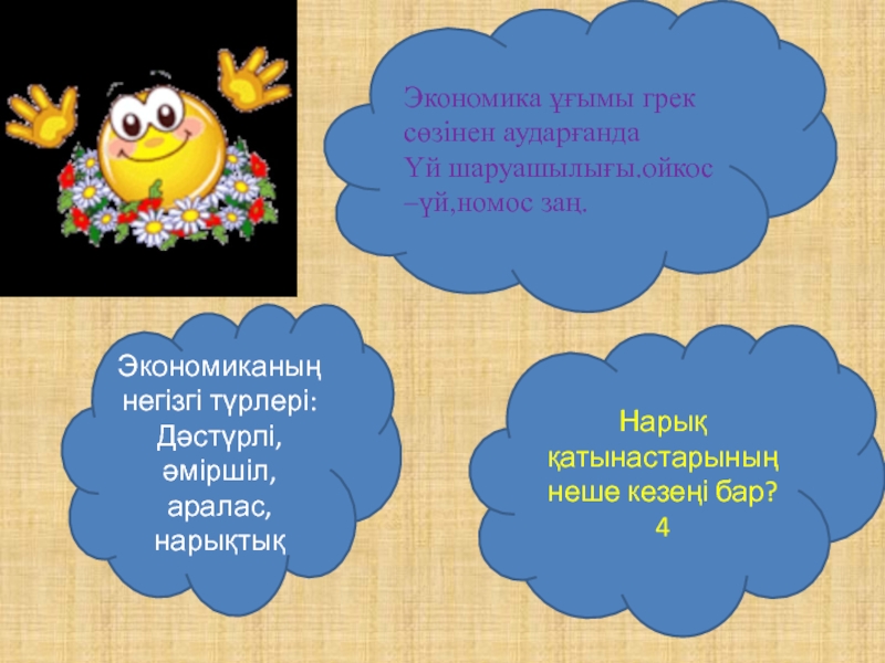 Экономика ұғымы грек сөзінен аударғанда Үй шаруашылығы.ойкос –үй,номос заң.Экономиканың негізгі түрлері:Дәстүрлі, әміршіл,аралас,нарықтықНарық қатынастарының неше кезеңі бар?4