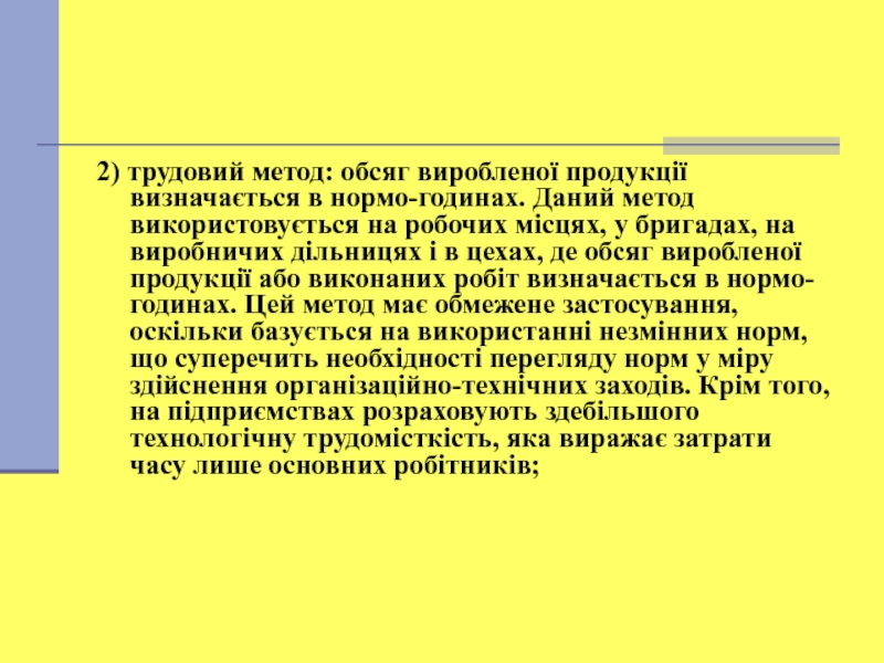 Слайд 192) трудовий метод: обсяг виробленої продукції визначається в нормо-годинах. Даний