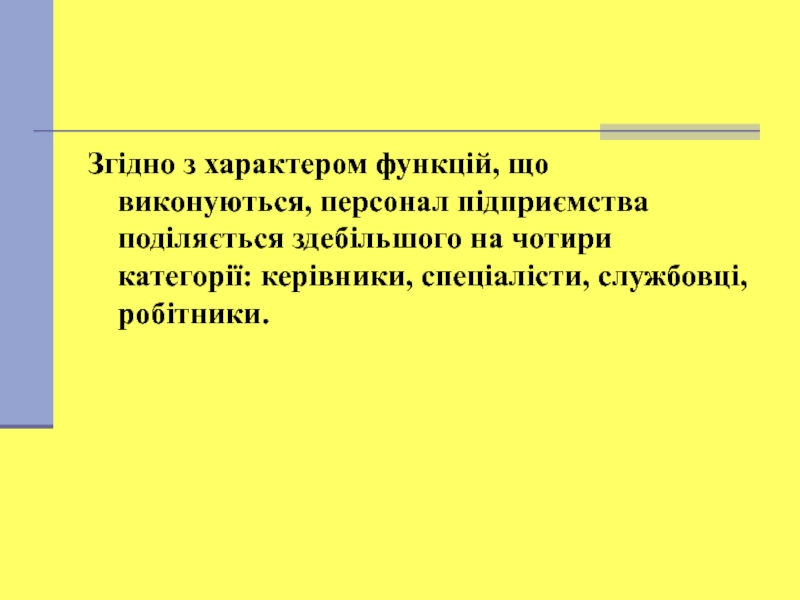 Слайд 5Згідно з характером функцій, що виконуються, персонал підприємства поділяється здебільшого