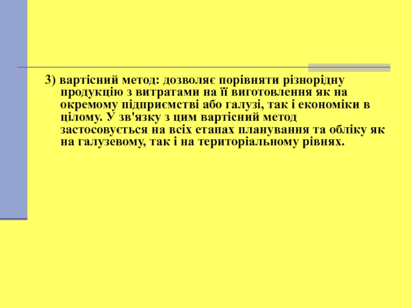 Слайд 203) вартісний метод: дозволяє порівняти різнорідну продукцію з витратами на