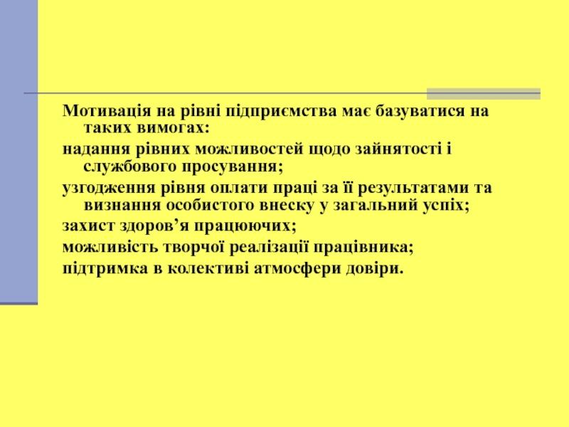 Слайд 22Мотивація на рівні підприємства має базуватися на таких вимогах: