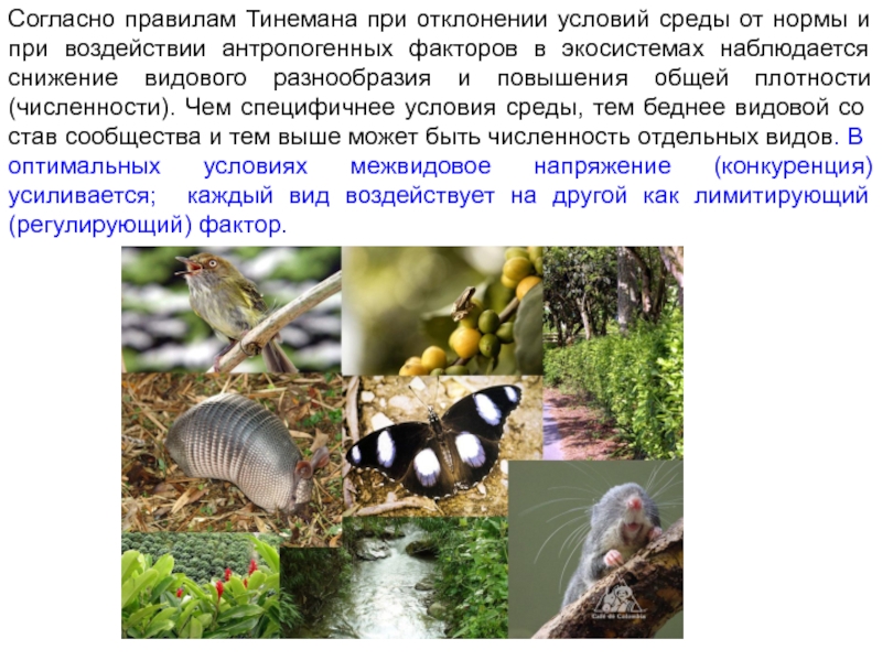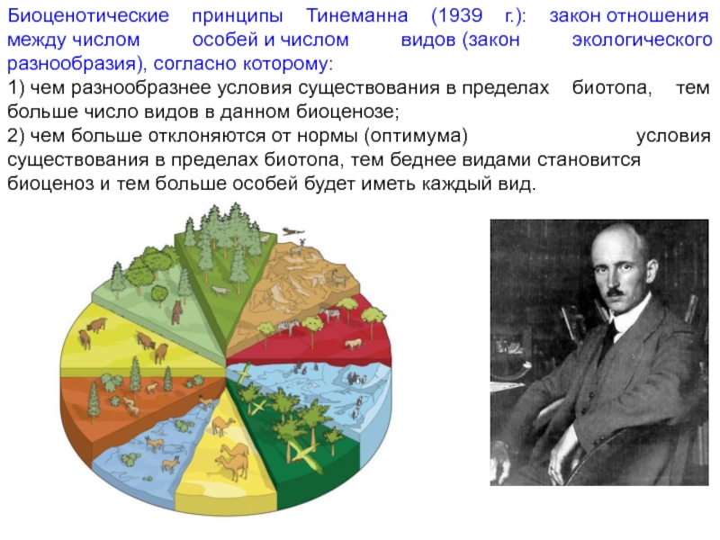 Слайд 29Биоценотические принципы Тинеманна (1939 г.): закон отношения между числом особей и числом видов (закон экологического