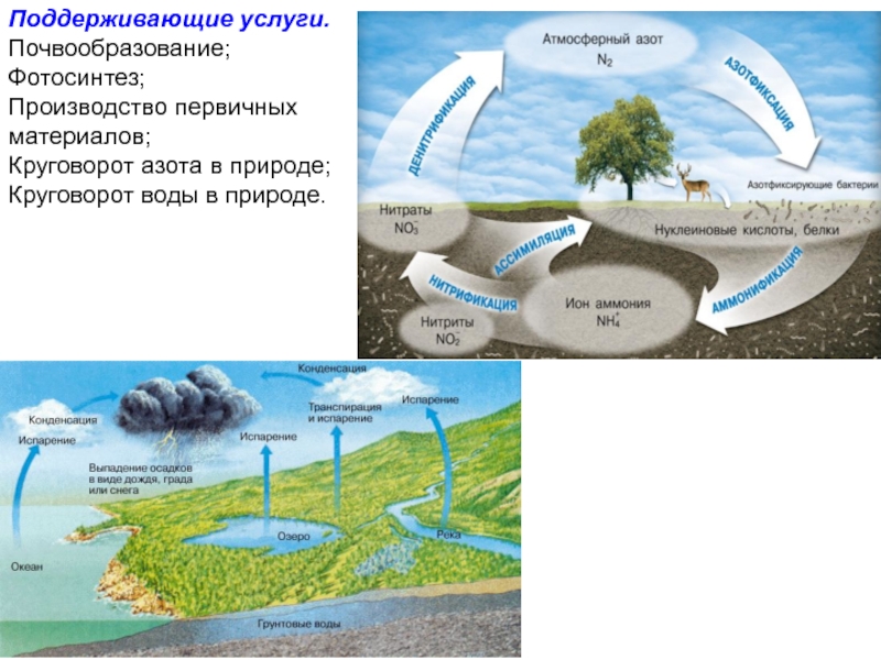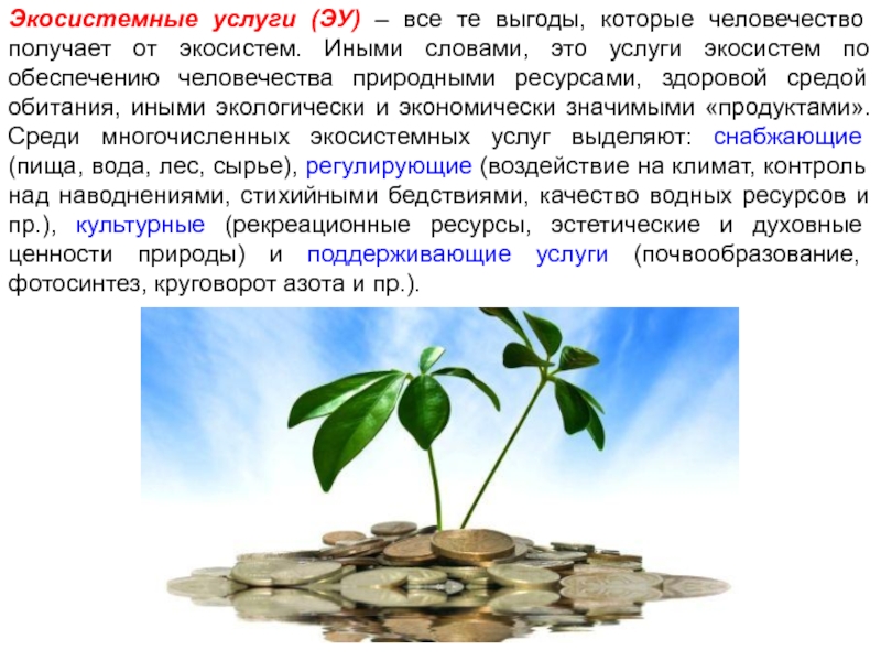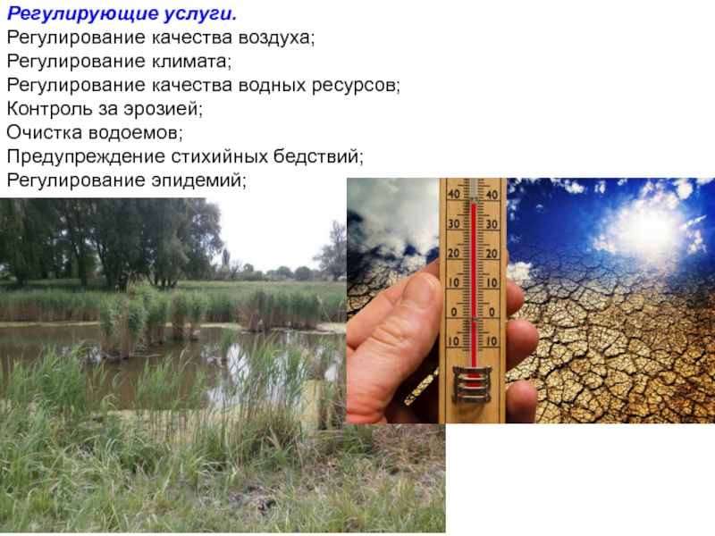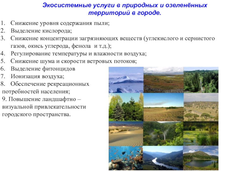 Слайд 65Экосистемные услуги в природных и озеленённых территорий в городе.