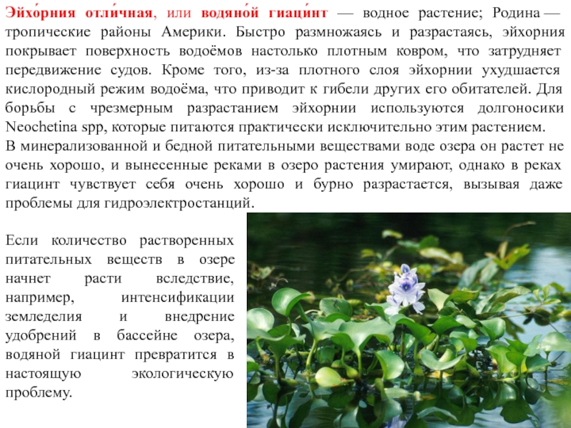 Слайд 23Эйхо́рния отли́чная, или водяно́й гиаци́нт — водное растение; Родина — тропические