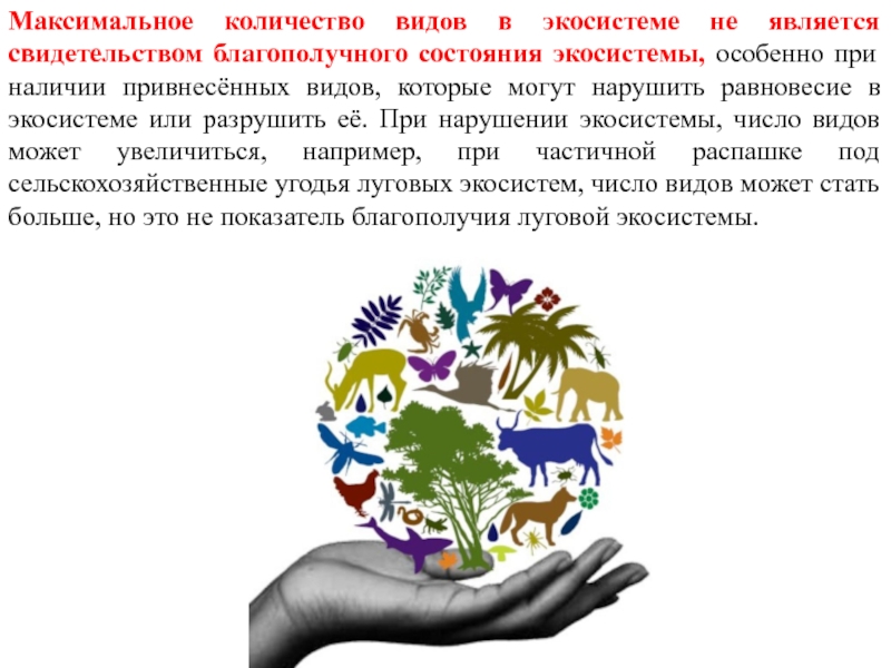 в экосистеме или разрушить её. При нарушении экосистемы, число видов может увеличиться, например, при частичной распашке под сельскохозяйственные угодья луговых экосистем, число видов может стать больше, но это не показатель благополучия луговой экосистемы.