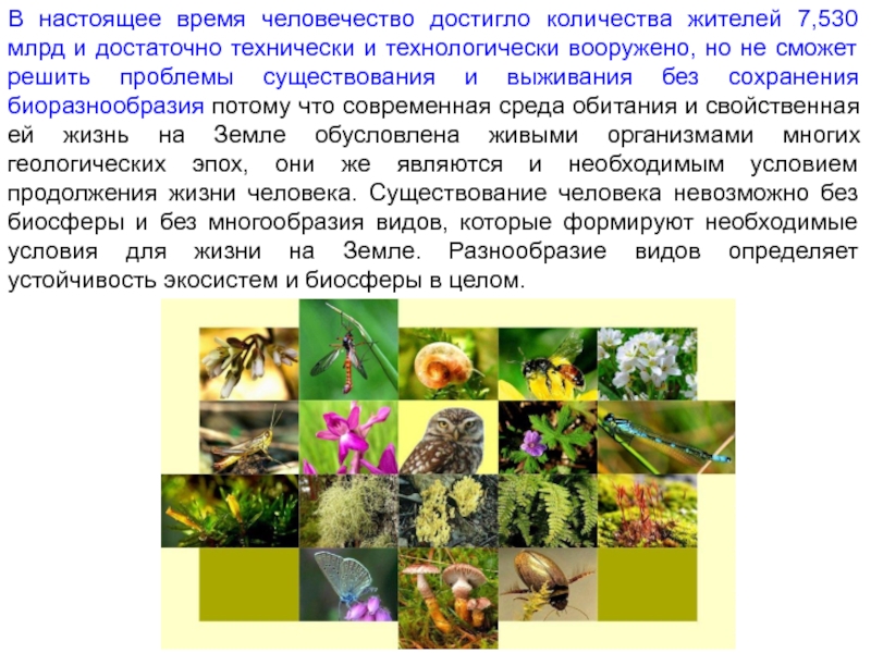 существования и выживания без сохранения биоразнообразия потому что современная среда обитания и свойственная ей жизнь на Земле обусловлена живыми организмами многих геологических эпох, они же являются и необходимым условием продолжения жизни человека. Существование человека невозможно без биосферы и без многообразия видов, которые формируют необходимые условия для жизни на Земле. Разнообразие видов определяет устойчивость экосистем и биосферы в целом.
