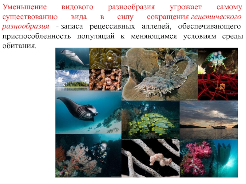 Слайд 24Уменьшение видового разнообразия угрожает самому существованию вида в силу сокращения генетического