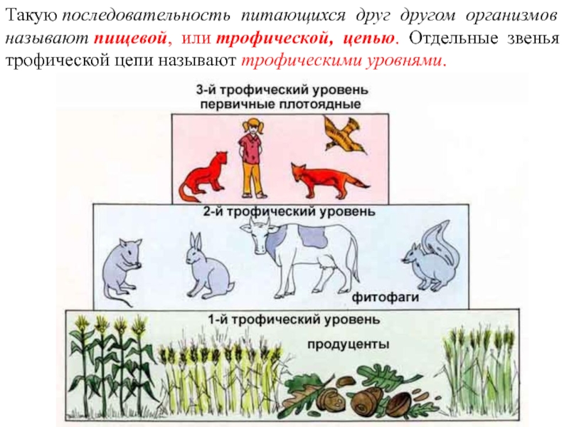 Последующие трофические уровни экосистемы формируются за счёт консументов (2-й, 3-й, 4-й и последующие уровни) и замыкаются редуцентами, которые переводят неживое органическое вещество в минеральную форму (абиотический компонент), которая может быть усвоена автотрофным элементом.