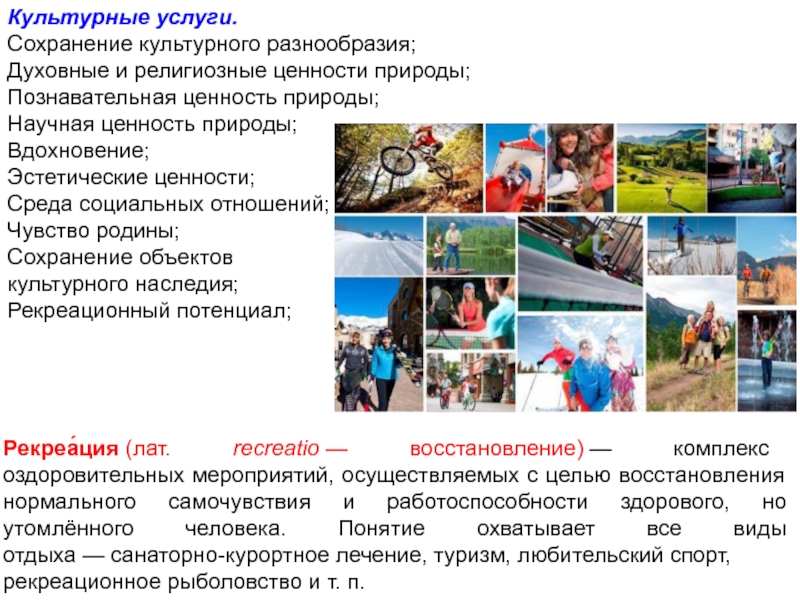 Рекреа́ция (лат. recreatio — восстановление) — комплекс оздоровительных мероприятий, осуществляемых с целью восстановления нормального самочувствия и работоспособности здорового, но утомлённого человека. Понятие охватывает все виды отдыха — санаторно-курортное лечение, туризм, любительский спорт, рекреационное рыболовство и т. п.
