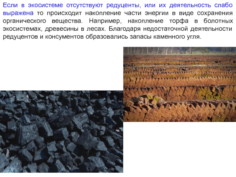 Например, накопление торфа в болотных экосистемах, древесины в лесах. Благодаря недостаточной деятельности редуцентов и консументов образовались запасы каменного угля.