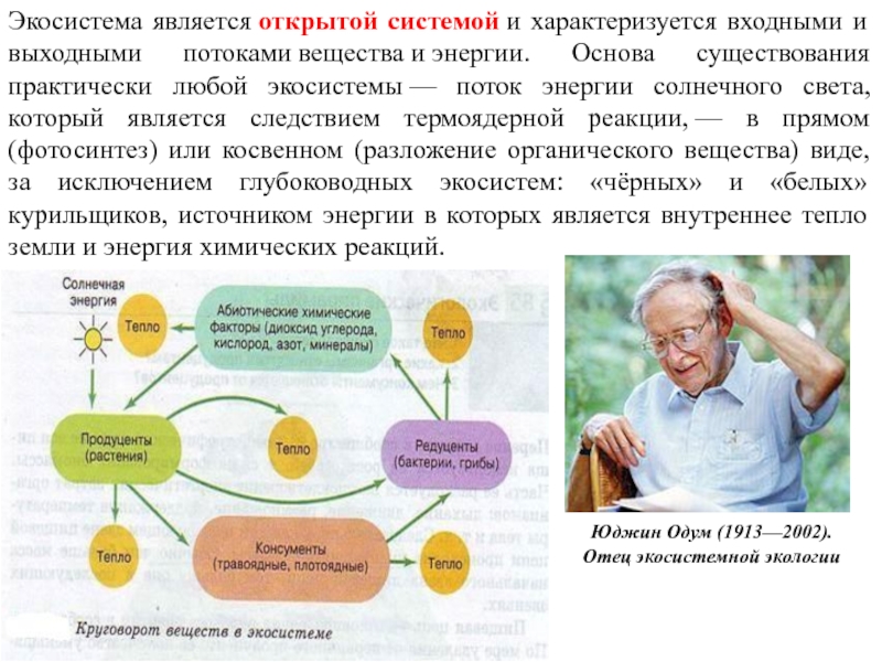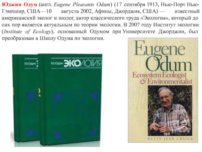Слайд 8Юджин Одум (англ. Eugene Pleasants Odum) (17 сентября 1913, Нью-Порт Нью-Гэмпшир, США—10 августа 2002, Афины, Джорджия, США) — известный американский эколог