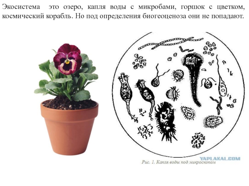 Слайд 13Экосистема это озеро, капля воды с микробами, горшок с цветком,