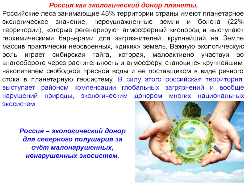 Россия – экологический донор для северного полушария за счёт малонарушенных, ненарушенных экосистем.