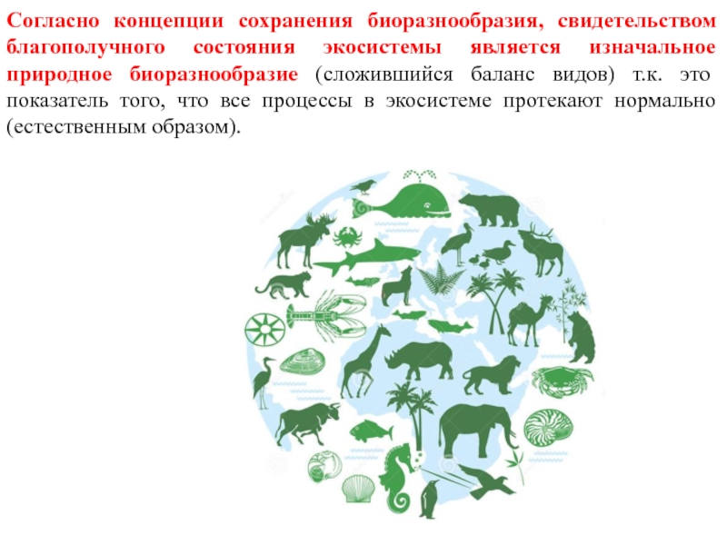 Слайд 25Согласно концепции сохранения биоразнообразия, свидетельством благополучного состояния экосистемы является изначальное