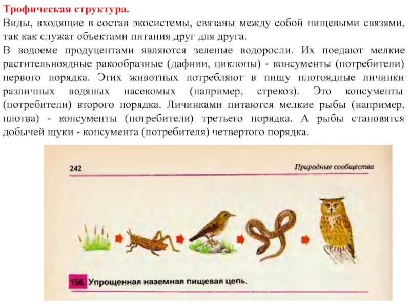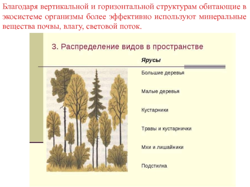 Слайд 14Структура экосистемы многопланова. Различают видовую, пространственную и трофическую структуры.
