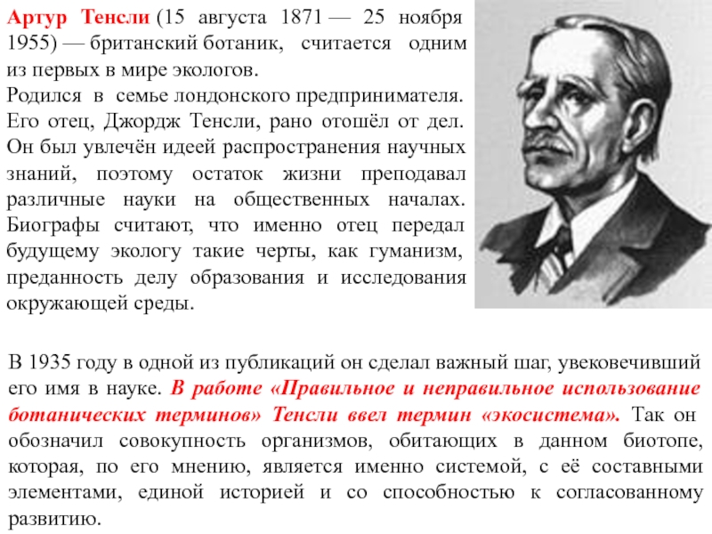 Слайд 9Артур Тенсли (15 августа 1871 — 25 ноября 1955) — британский ботаник, считается одним из