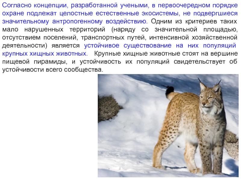 таких мало нарушенных территорий (наряду со значительной площадью, отсутствием поселений, транспортных путей, интенсивной хозяйственной деятельности) является устойчивое существование на них популяций крупных хищных животных. Крупные хищные животные стоят на вершине пищевой пирамиды, и устойчивость их популяций свидетельствует об устойчивости всего сообщества.