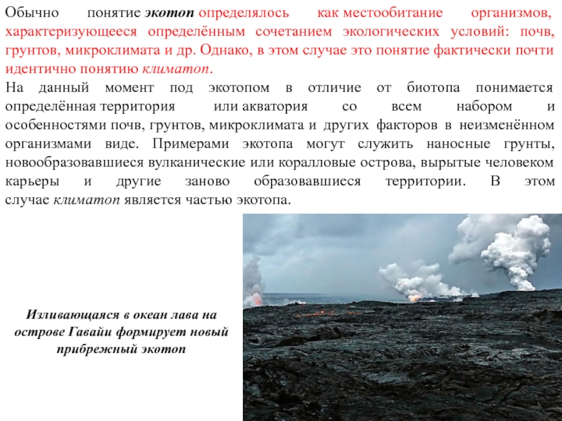 Слайд 11Обычно понятие экотоп определялось как местообитание организмов, характеризующееся определённым сочетанием экологических условий: почв,