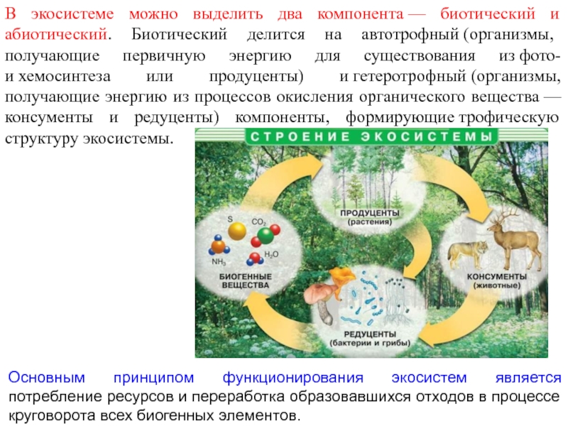 Слайд 4В экосистеме можно выделить два компонента — биотический и абиотический. Биотический