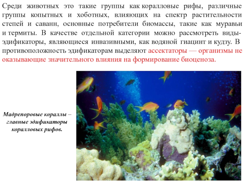 Слайд 19Среди животных это такие группы как коралловые рифы, различные группы копытных