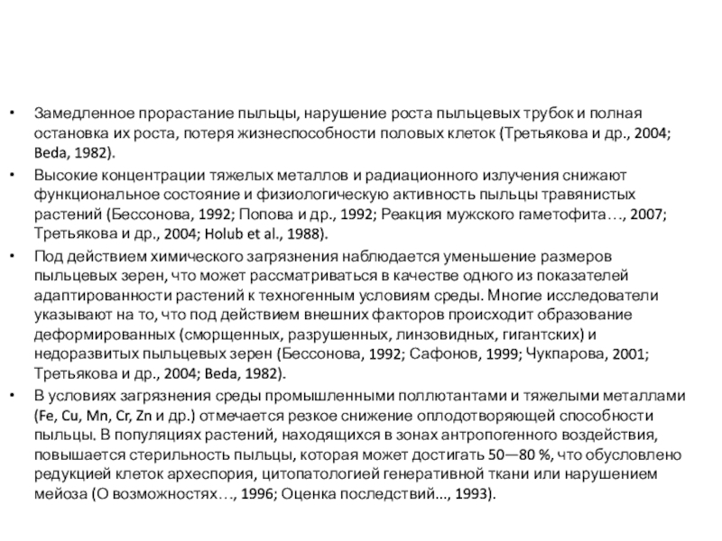 Высокие концентрации тяжелых металлов и радиационного излучения снижают функциональное состояние и физиологическую активность пыльцы травянистых растений (Бессонова, 1992; Попова и др., 1992; Реакция мужского гаметофита…, 2007; Третьякова и др., 2004; Holub et al., 1988).
