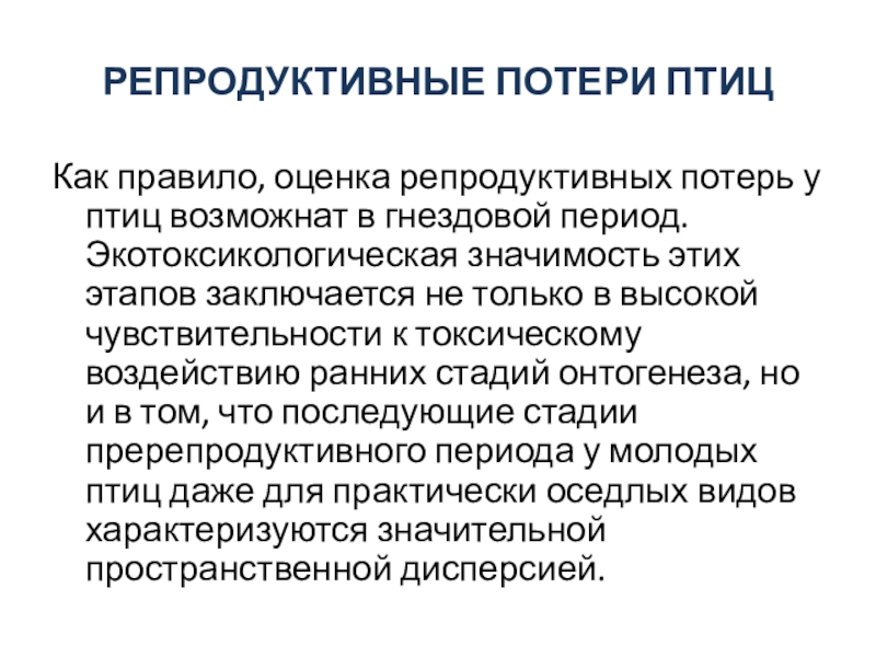 в высокой чувствительности к токсическому воздействию ранних стадий онтогенеза, но и в том, что последующие стадии пререпродуктивного периода у молодых птиц даже для практически оседлых видов характеризуются значительной пространственной дисперсией.