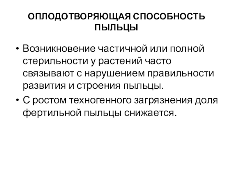 В условиях загрязнения среды промышленными поллютантами и тяжелыми металлами (Fe, Cu, Mn, Cr, Zn и др.) отмечается резкое снижение оплодотворяющей способности пыльцы. В популяциях растений, находящихся в зонах антропогенного воздействия, повышается стерильность пыльцы, которая может достигать 50—80 %, что обусловлено редукцией клеток археспория, цитопатологией генеративной ткани или нарушением мейоза (О возможностях…, 1996; Оценка последствий..., 1993).
