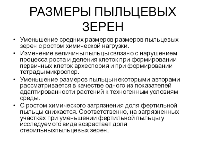 Под действием химического загрязнения наблюдается уменьшение размеров пыльцевых зерен, что может рассматриваться в качестве одного из показателей адаптированности растений к техногенным условиям среды. Многие исследователи указывают на то, что под действием внешних факторов происходит образование деформированных (сморщенных, разрушенных, линзовидных, гигантских) и недоразвитых пыльцевых зерен (Бессонова, 1992; Сафонов, 1999; Чукпарова, 2001; Третьякова и др., 2004; Beda, 1982).