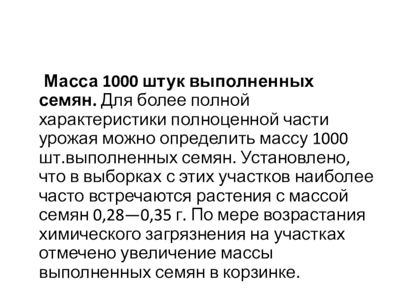 в выборках с этих участков наиболее часто встречаются растения с массой семян 0,28—0,35 г. По мере возрастания химического загрязнения на участках отмечено увеличение массы выполненных семян в корзинке.