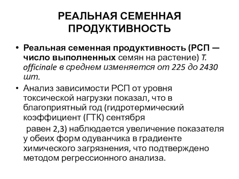 Слайд 13РЕАЛЬНАЯ СЕМЕННАЯ ПРОДУКТИВНОСТЬ