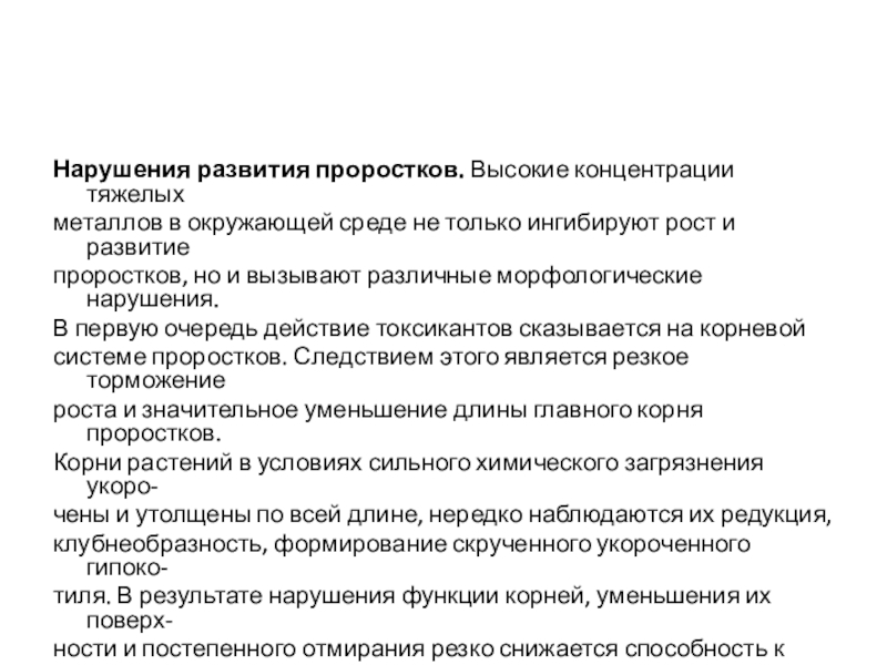 Слайд 17Нарушения развития проростков. Высокие концентрации тяжелых