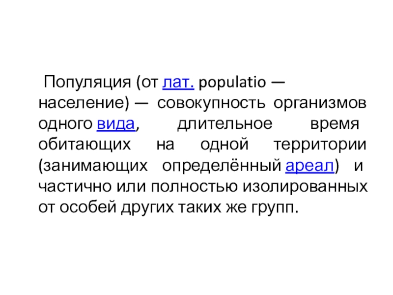 Слайд 2 Популяция (от лат. populatio — население) — совокупность организмов одного вида, длительное время обитающих на одной