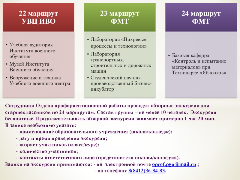 Заявки на экскурсии принимаются: - по электронной почте oprof.pgu@mail.ru ;