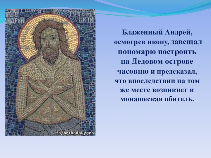 Слайд 10Блаженный Андрей, осмотрев икону, завещал пономарю построить на Дедовом острове
