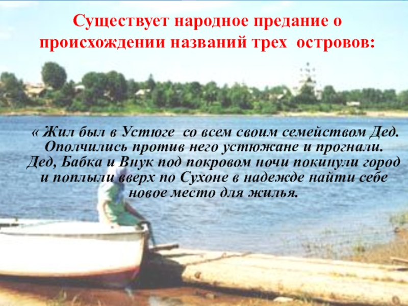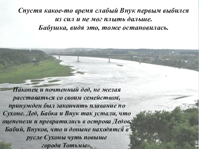 Наконец и почтенный дед, не желая расставаться со своим семейством, принужден был закончить плавание по Сухоне. Дед, Бабка и Внук так устали, что оцепенели и превратились в острова Дедов, Бабий, Внуков, что и доныне находятся в русле Сухоны чуть повыше города Тотьмы».