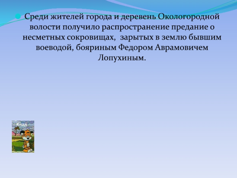Слайд 13Среди жителей города и деревень Окологородной волости получило распространение предание