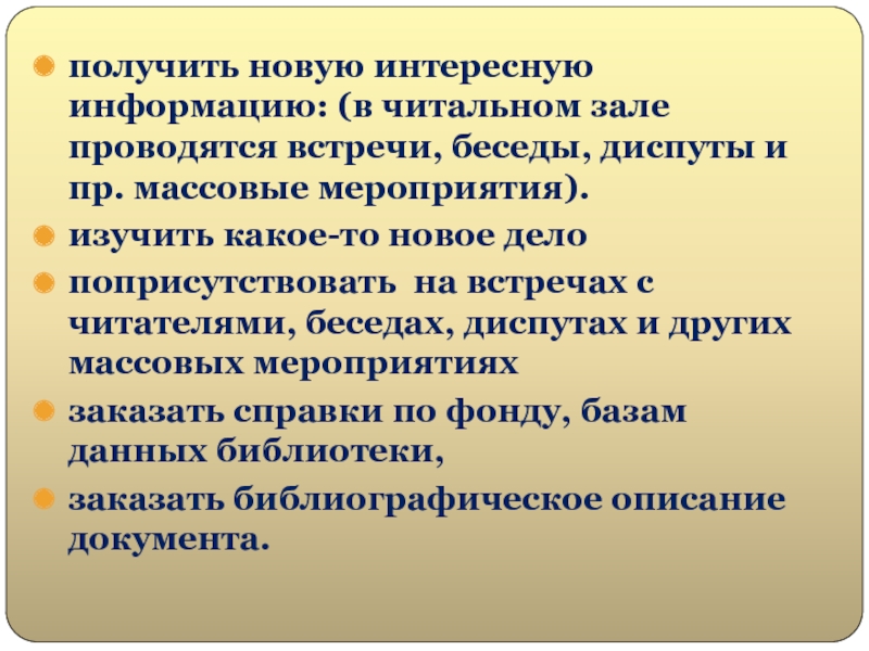 Слайд 20получить новую интересную информацию: (в читальном зале проводятся встречи, беседы,