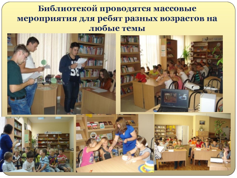 Слайд 23Библиотекой проводятся массовые мероприятия для ребят разных возрастов на любые