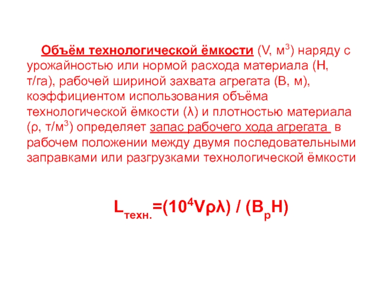 коэффициентом использования объёма технологической ёмкости (λ) и плотностью материала (ρ, т/м3) определяет запас рабочего хода агрегата в рабочем положении между двумя последовательными заправками или разгрузками технологической ёмкости