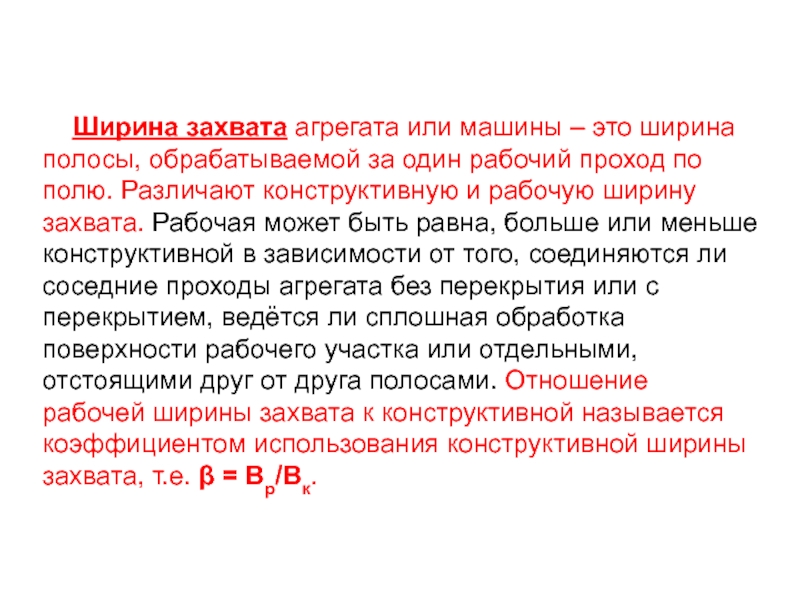 Слайд 10Ширина захвата агрегата или машины – это ширина полосы, обрабатываемой