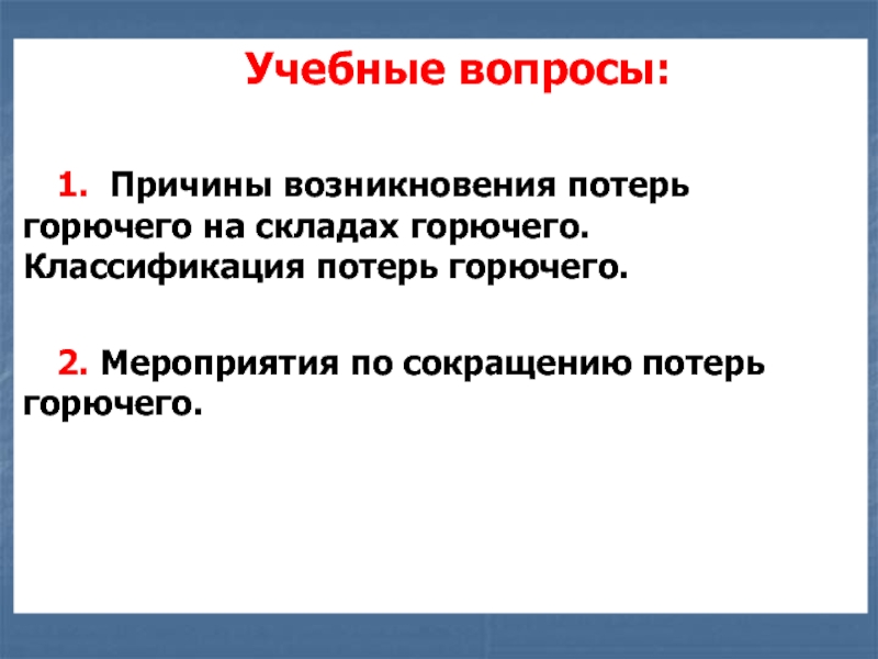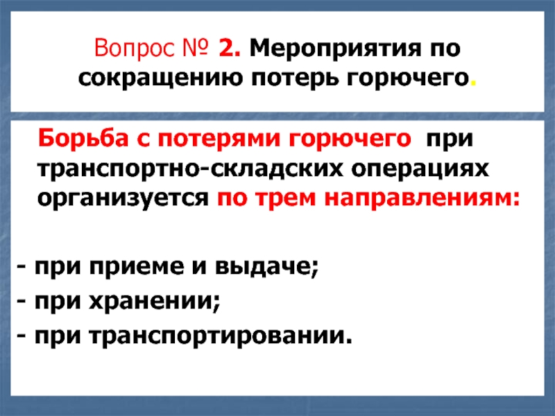 Слайд 16Вопрос № 2. Мероприятия по сокращению потерь горючего.