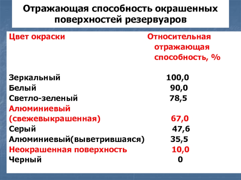 Слайд 24Отражающая способность окрашенных поверхностей резервуаров