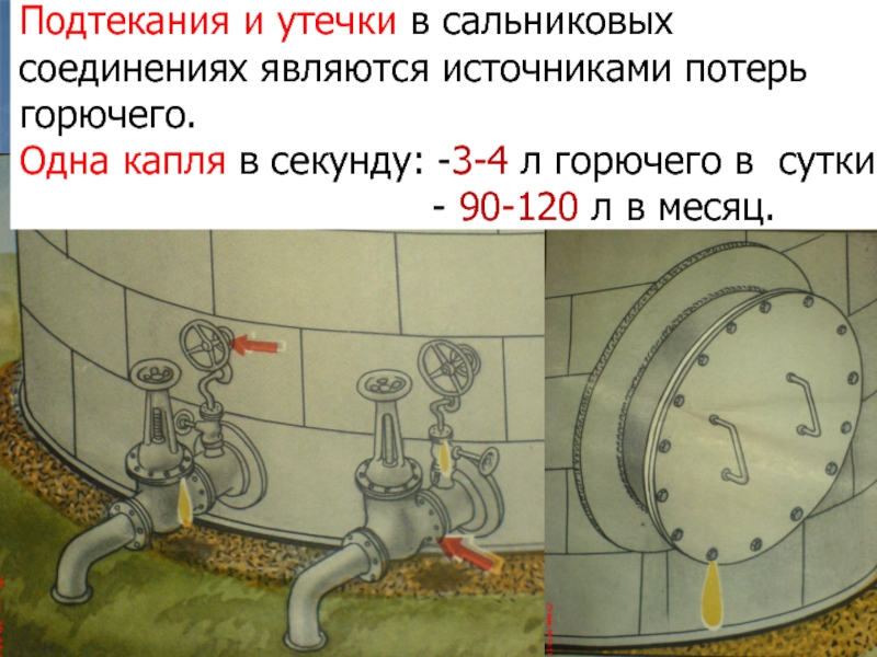 Слайд 29Подтекания и утечки в сальниковых соединениях являются источниками потерь горючего.