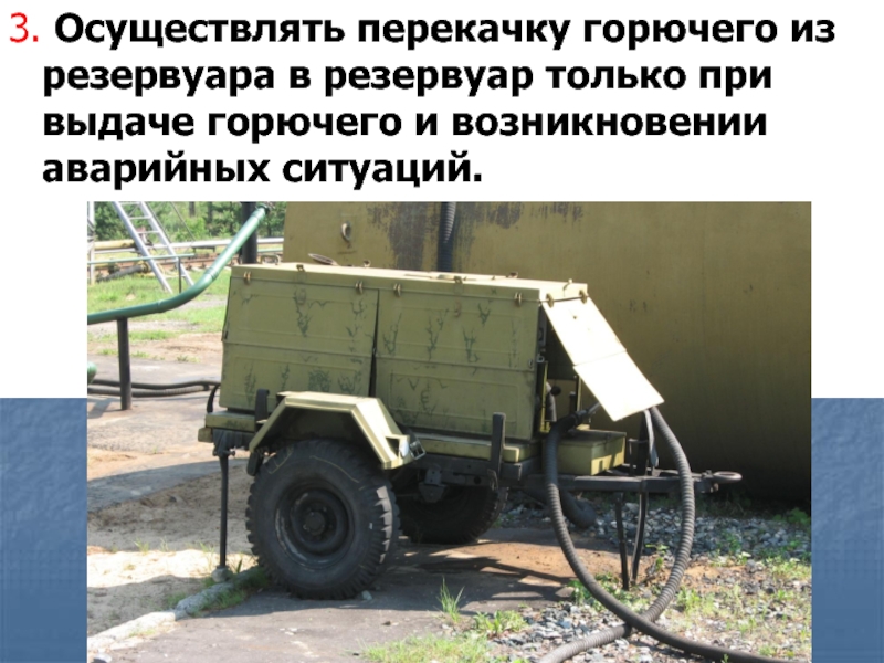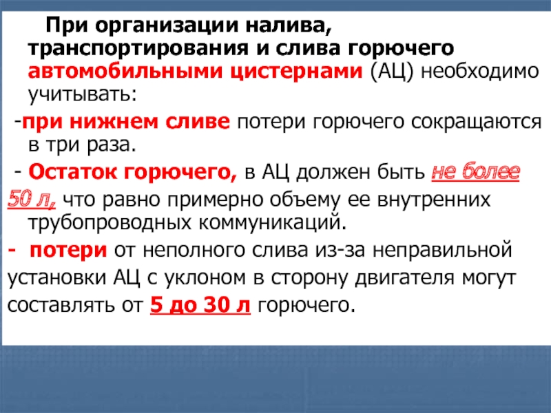 Слайд 31 При организации налива, транспортирования и слива горючего