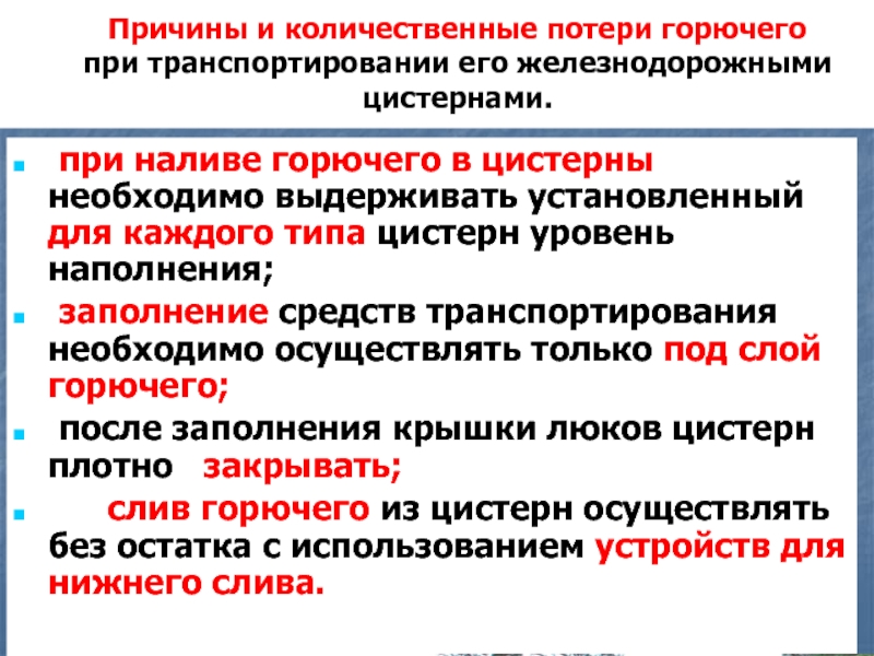 наливе горючего в цистерны необходимо выдерживать установленный для каждого типа