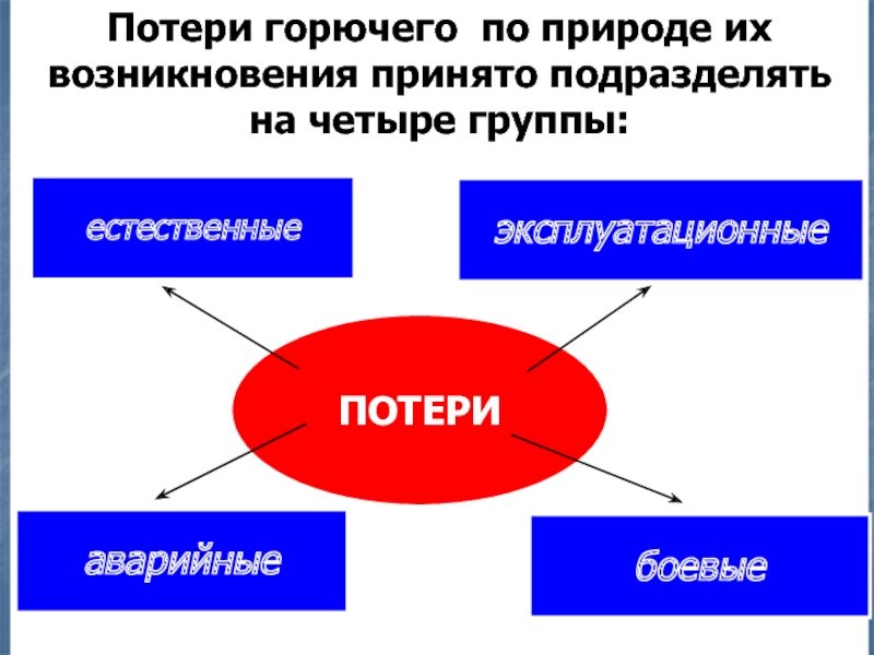 Слайд 4Потери горючего по природе их возникновения принято подразделять на четыре