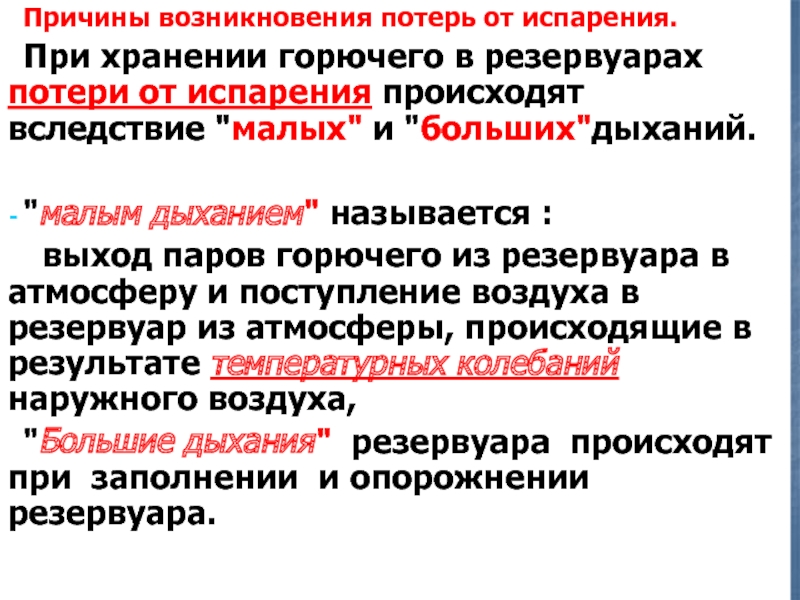 Слайд 13Причины возникновения потерь от испарения.