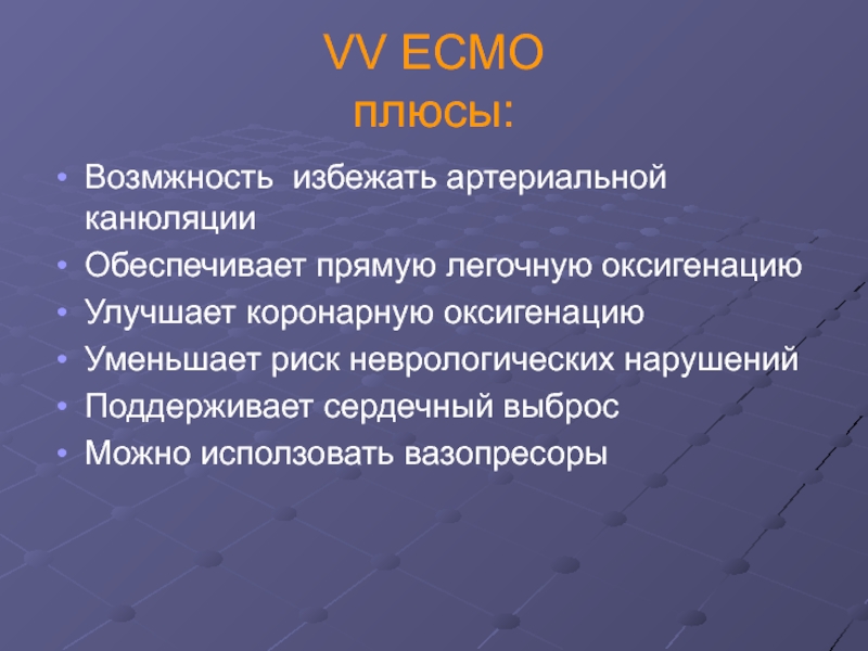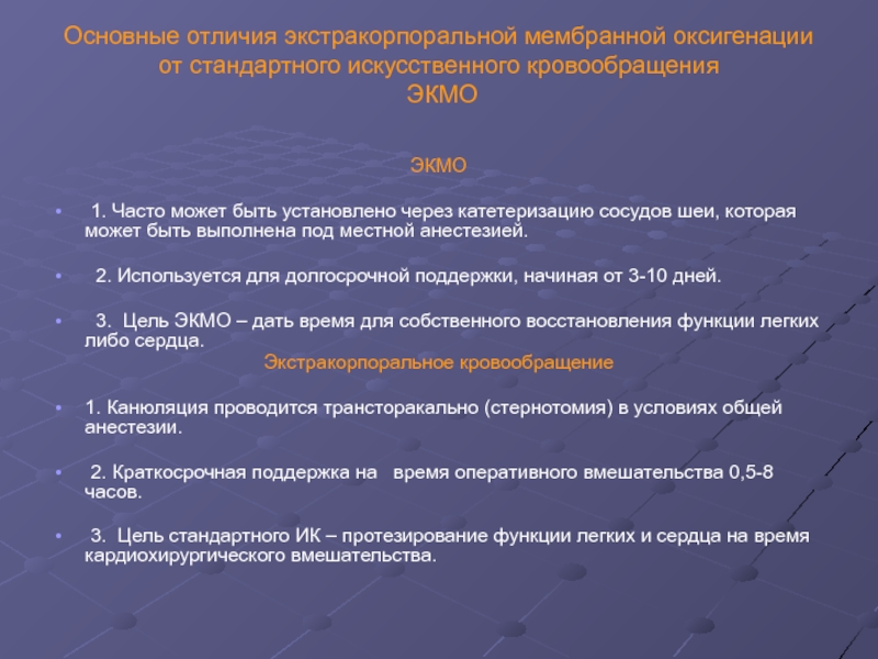 Слайд 18Основные отличия экстракорпоральной мембранной оксигенации от стандартного искусственного кровообращения