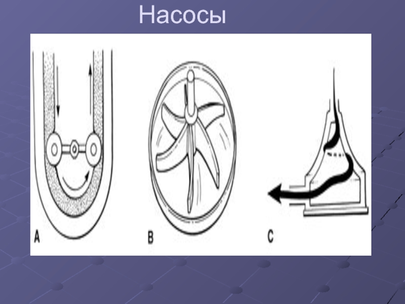 Насос. Виды насосов: роликовый (А), центрифужный (В), перистальтический